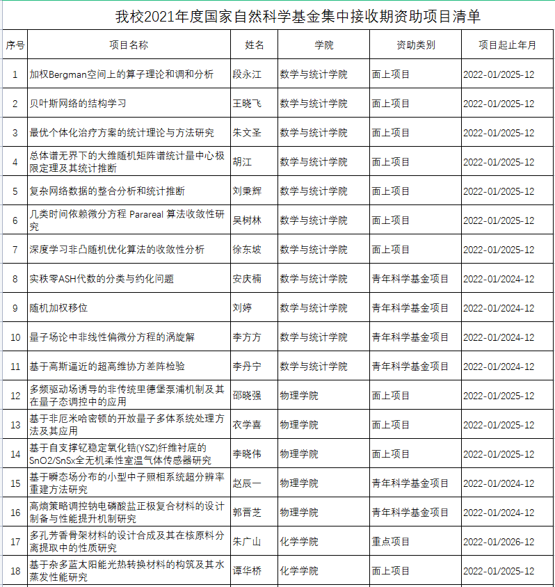 我校2021年度国家自然科学基金集中接收期资助项目清单(部分)