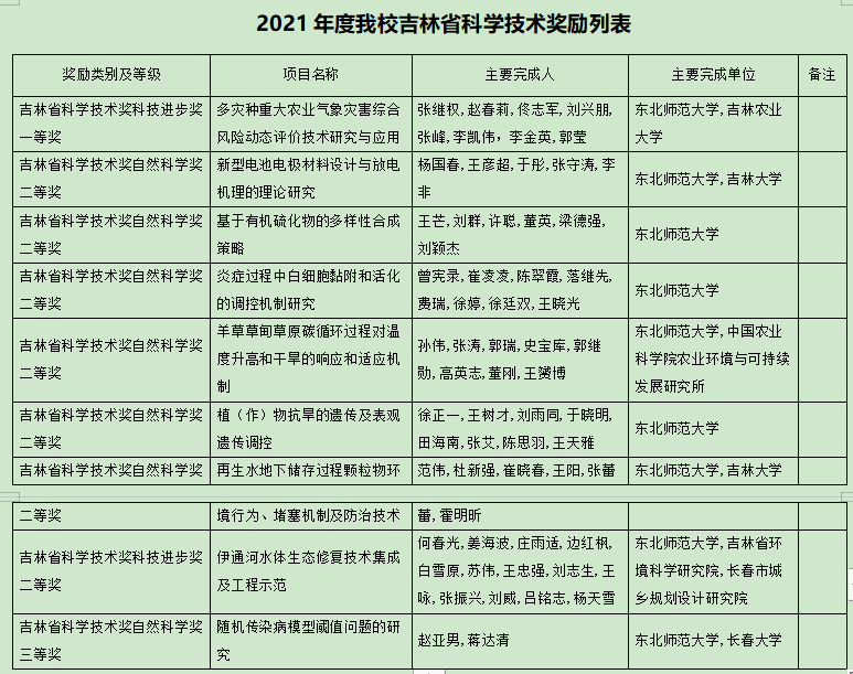 2021年度我校吉林省科学技术奖励列表