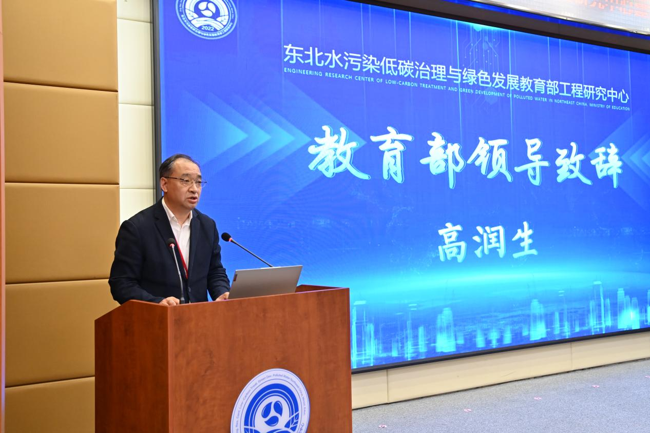 兰恒斌代表学校在会上致辞。他介绍了学校历史沿革、人才培养、教育教学、“双一流”学科建设等情况,指出我校是国内最早从事环境科学人才培养的高校之一,一直高度重视环境学科的建设与发展,特别是在研发与推广水环境治理与水生态修复技术方面取得突破性成果。东北水污染低碳治理与绿色发展工程研究中心获批成立,不仅代表了教育部对我校环境学科建设的充分肯定,更对促进东北区域生态文明建设、国家“双碳”目标实现以及国家生态环境高层次人才队伍建设具有重要意义。未来,学校将牢固践行绿色低碳循环发展的理念,加强顶层设计,对中心建设给予充分保障和支持;充分发挥环境生态学科优势,在东北区域水污染治理新理论、新技术、新装备等方向持续探索发力;进一步加强主动谋划、对接、服务国家和行业产业发展需要,与共建单位加强合作,推进科研成果转化,促进东北老工业基地从工业文明向生态文明的低碳绿色转型。