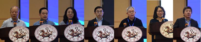 在基调演讲环节,杨伯江作了题为《战后日本对东亚政策综合考察》的基调演讲。他以亚洲、东亚等概念的变迁为出发点,综合考虑历史背景与现实状况影响,从三个时期、四个角度对战后日本制定执行的对东亚政策进行了梳理,指出了其战略重点与政策主线的视角调整与微妙变化。宋成有以《中国日本史研究主体性与学脉传承的再思考》为题,围绕邹有恒先生的外国史研究这一主题,系统性地阐述了邹先生对于建立中国特色日本史研究的独特贡献,指出了在日本史研究中应采取的“实事求是”和“结合现实”的“双实”路径,并对主体性与学脉传承这两个建立中国日本史研究体系的核心问题进行了展望。宋志勇的基调演讲的题目为《日本十四年侵华战争与对华认识》,指出,日本对中国发动侵略战争的心理根源应追溯至近代以后日本长期形成的对华认识和对华观。他对日本的错误对华认识和对华观进行了分类整理与脉络梳理,并以此为基础对未来中日关系的发展做出了展望。赖正维教授围绕《琉球问题的历史、现状与未来》,针对二十世纪八十年代迄今包括台湾、香港在内的中国史学界关于琉球历史及中琉关系史研究的进展及学术成果做出了相应回顾与梳理,点明了琉球问题研究的特点与今后关注的课题,并结合冲绳知事访华一事阐明琉球问题研究的重要意义。